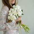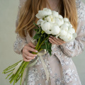 Букет из белых пионовидных роз и нежных кустовых роз в упаковке