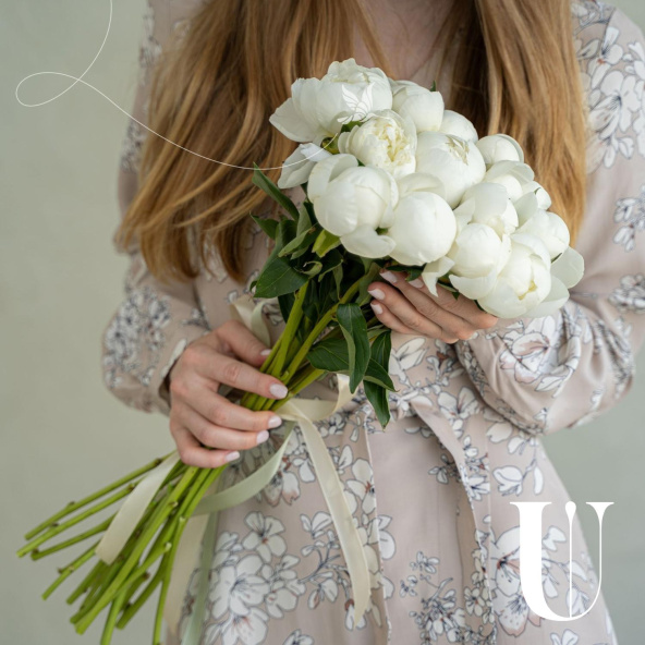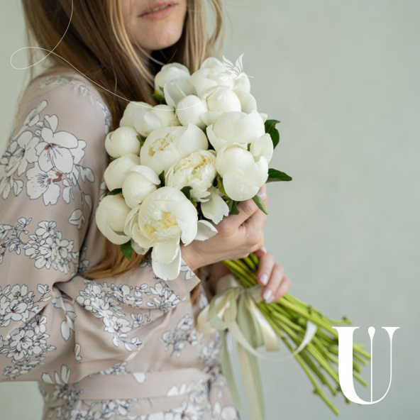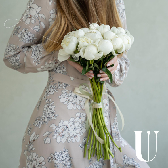 Монобукет из 15 нежно-розовых пионов с розовой лентой