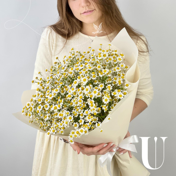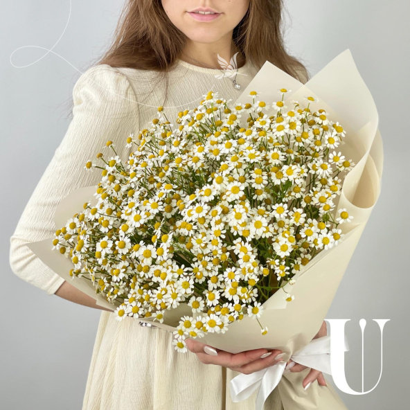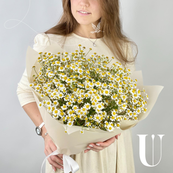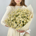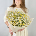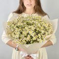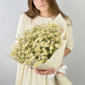Букет из белых кустовых хризантем в дизайнерской упаковке