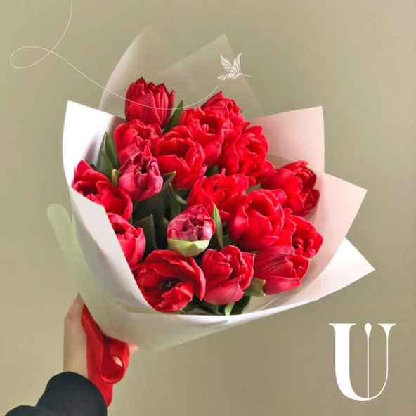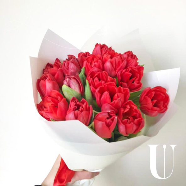 Монобукет из 15 белых тюльпанов в дизайнерской упаковкек