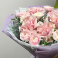 Букет из розовых кустовых пионовидных роз в упаковке