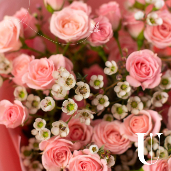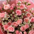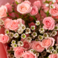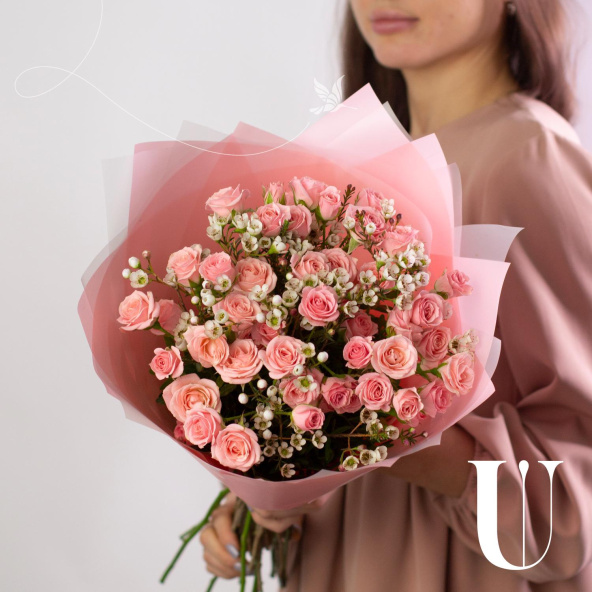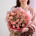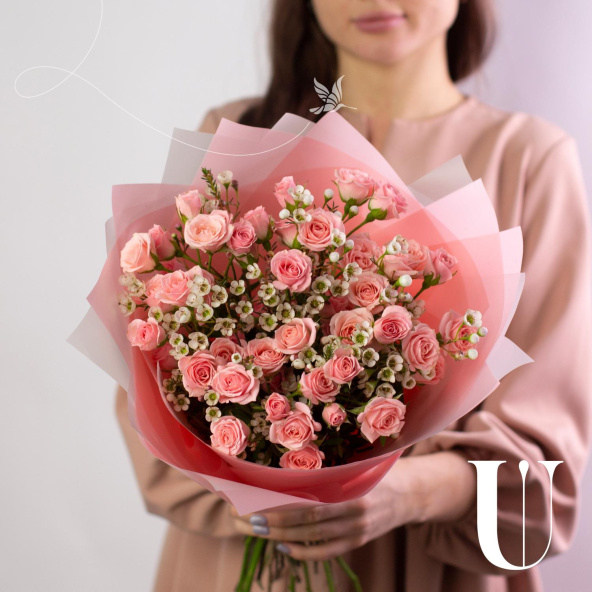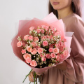 Монобукет из кустовых роз сортов Лидия и Яна в розовой упаковке