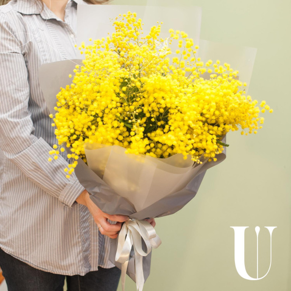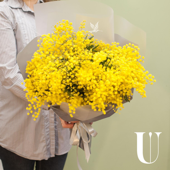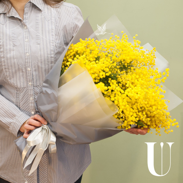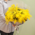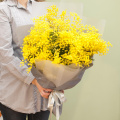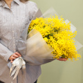 Монобукет из желтых гербер и эвкалипта в упаковке