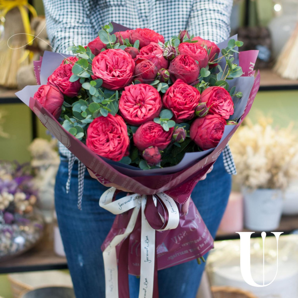 Букет состоит из 17 пионовидных красных роз, которые придают ему неповторимый шарм и элегантность. Красные розы - символ любви и страсти, они всегда будут уместны и желанны.