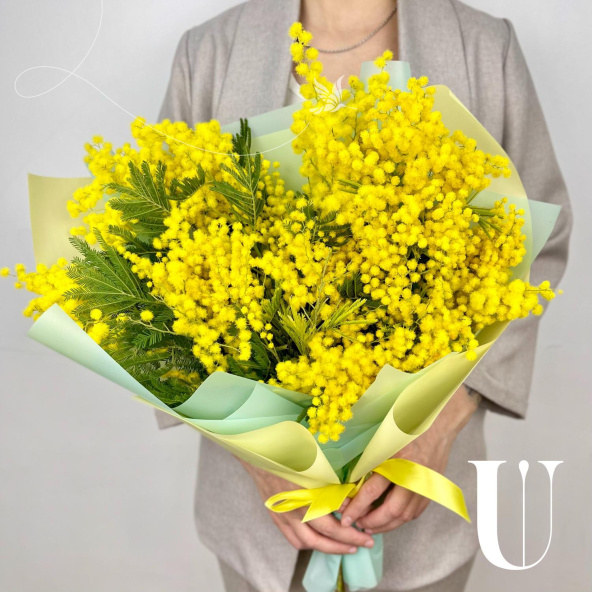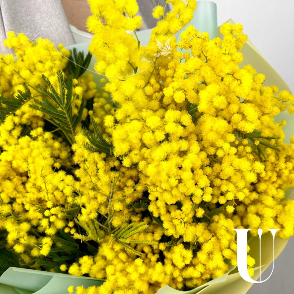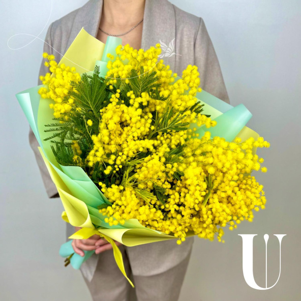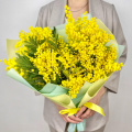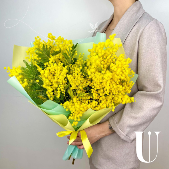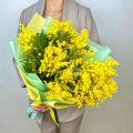 Монобукет из 29 желтых тюльпанов и бирюзового лагуруса в крафтовой упаковке