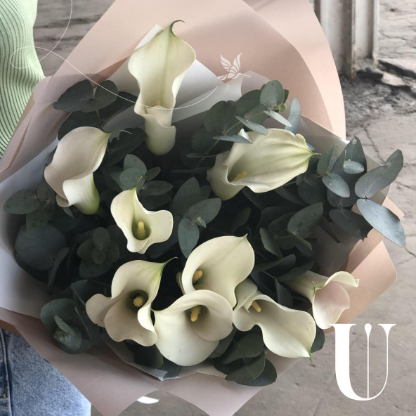 Чарующий букет из каллы и эвкалипта станет стильным подарком на любое торжество