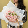 Монобукет из 7 розовых пионов и эвкалипта в упаковке