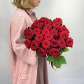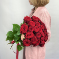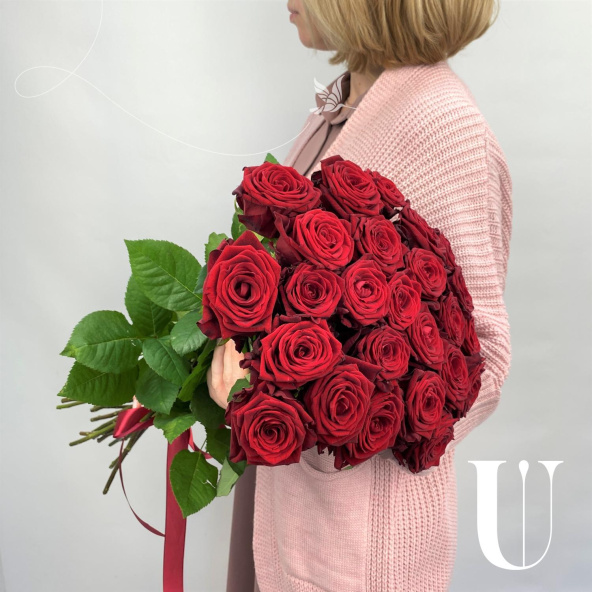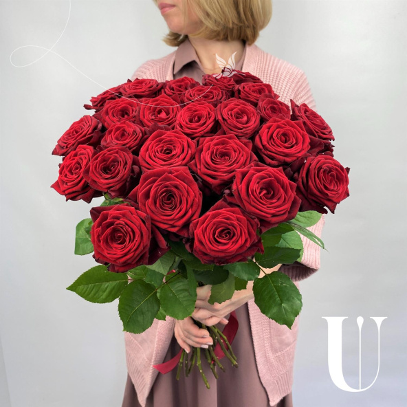 Монобукет из 25 красных роз Ред Наоми в черной упаковке