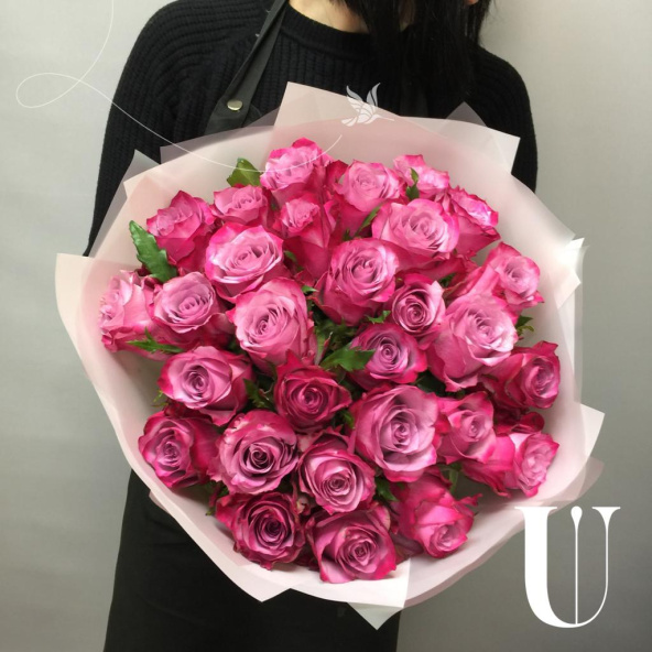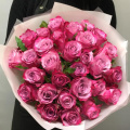 Букет из фиолетовых и розовых роз в в крафтовой упаковке