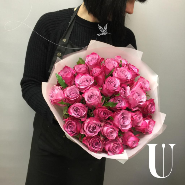 Монобукет из 19 розовых роз сорта Космик в упаковке тиффани