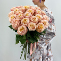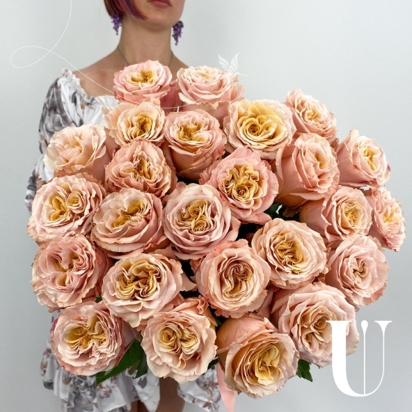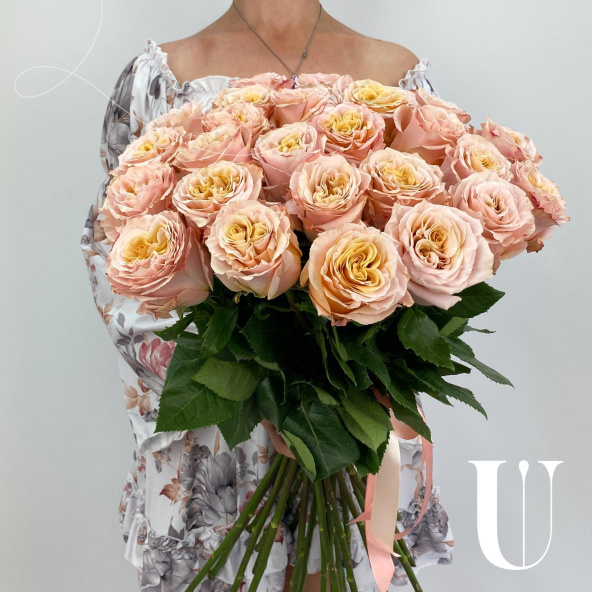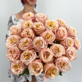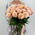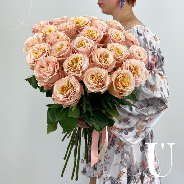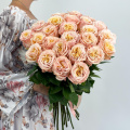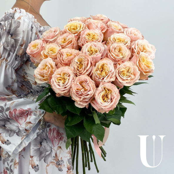 Монобукет из 25 пионовидных розовых роз в дизайнерской упаковке