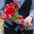 Монобукет из анемонов с лентой подчеркивает уникальность и индивидуальность подарка.