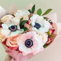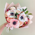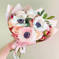 Букет из белых кустовых пионовидных роз сорта Бомбастик в упаковке