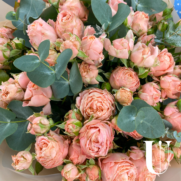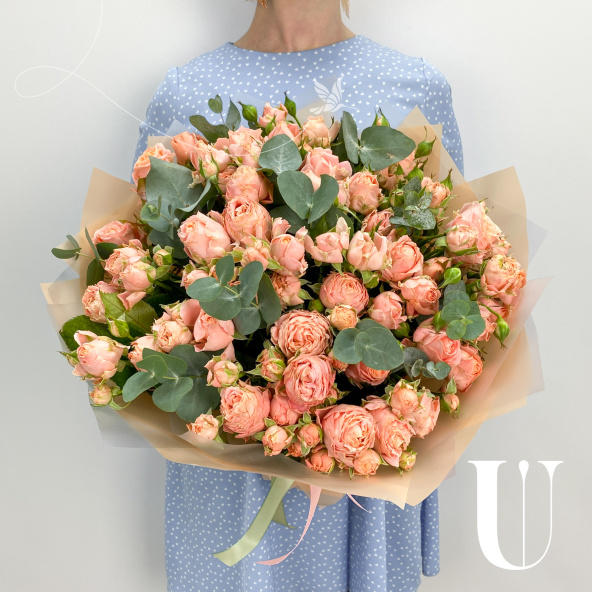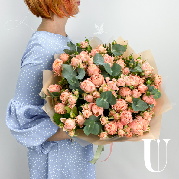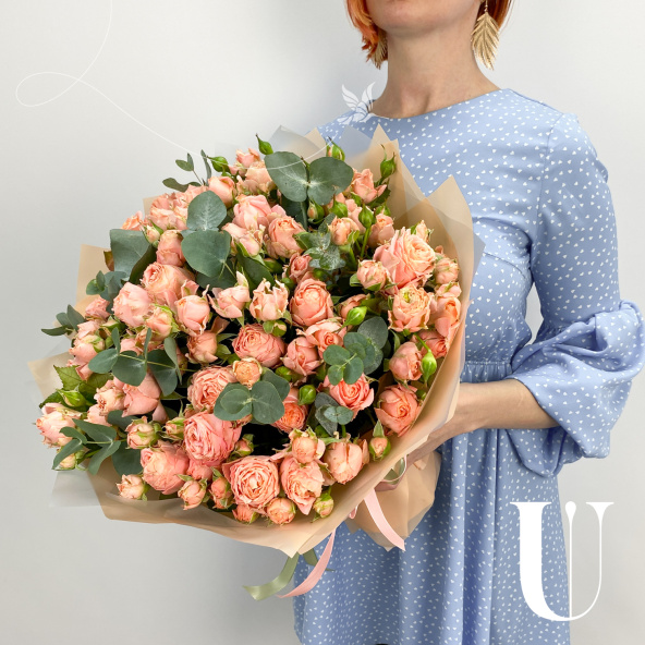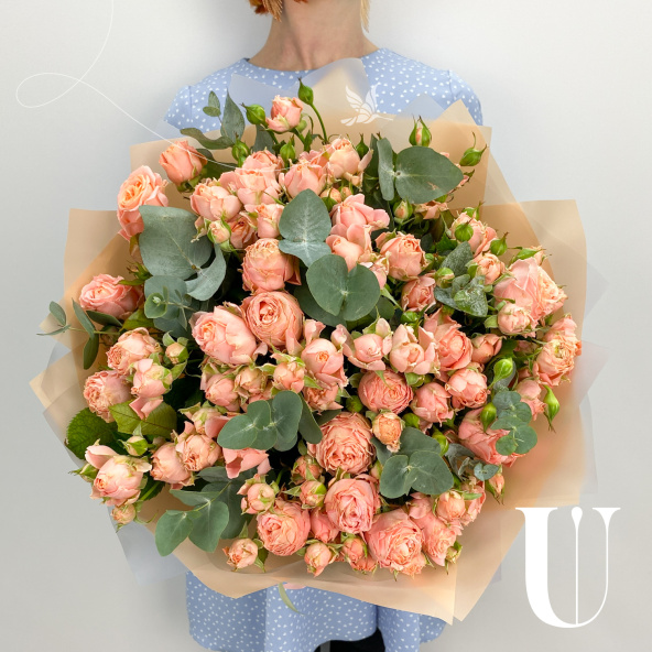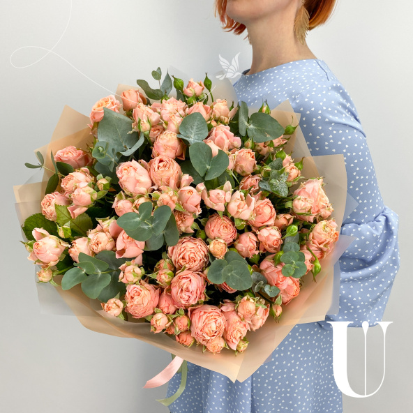 Нежные кустовые пионовидные розы в дизайнерской упаковке