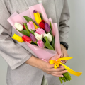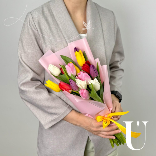 Монобукет из 15 белых тюльпанов в дизайнерской упаковкек