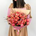 Монобукет из 19 розовых гербер и ветви малины в упаковке