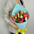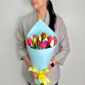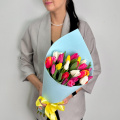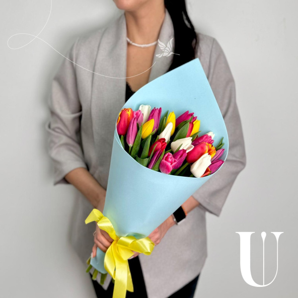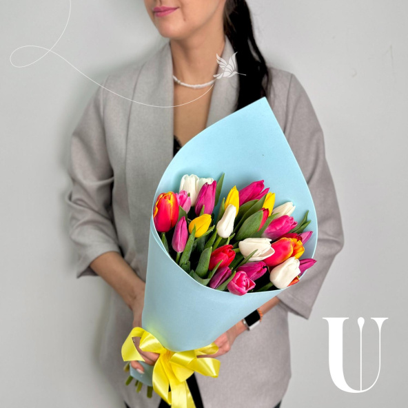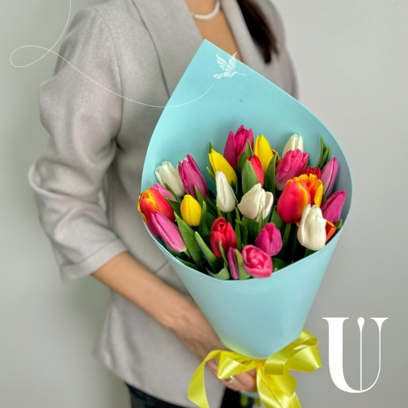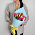 Монобукет из 29 желтых тюльпанов и бирюзового лагуруса в крафтовой упаковке
