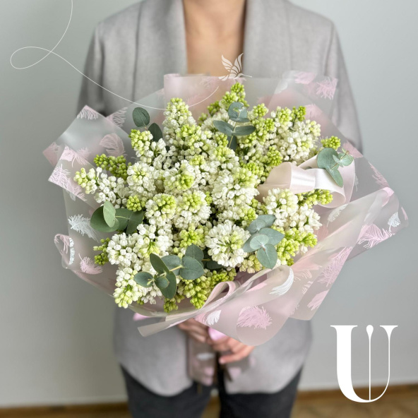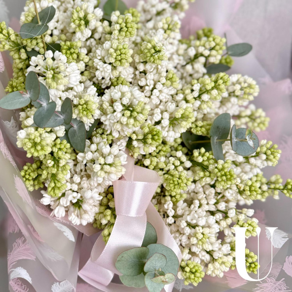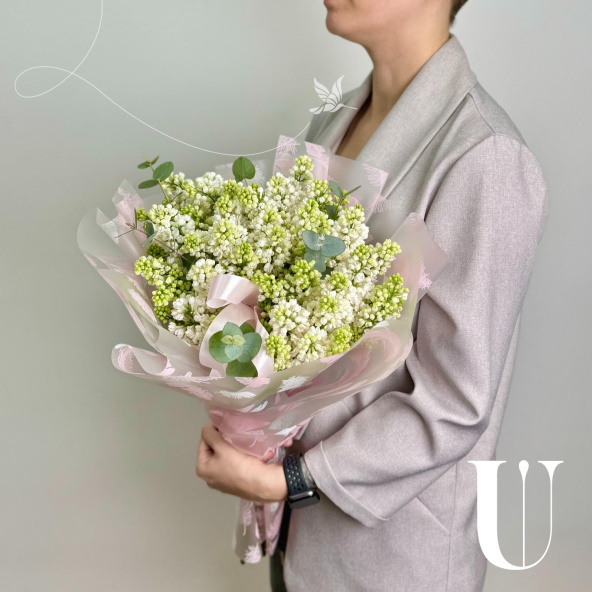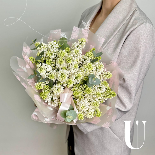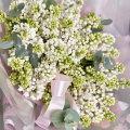 Монобукет в нежной гамме из маттиол в темно-фиолетовой пленке