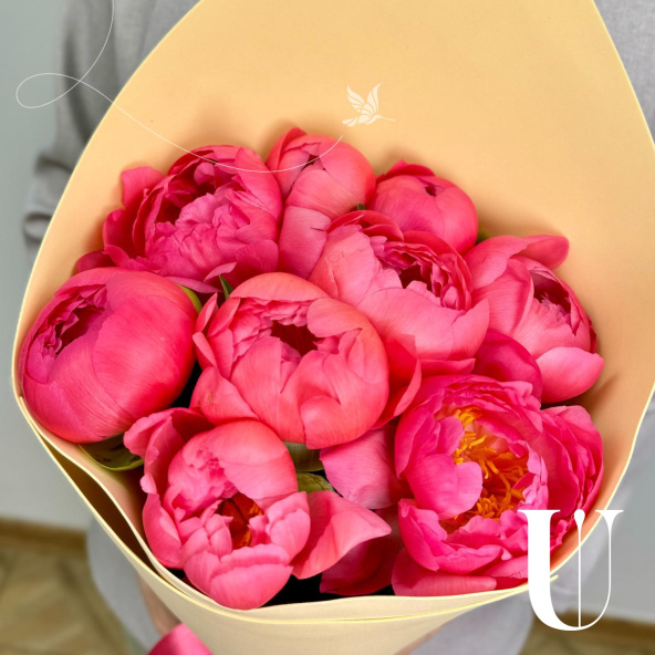 Монобукет из 15 коралловых пионов с розовой лентой