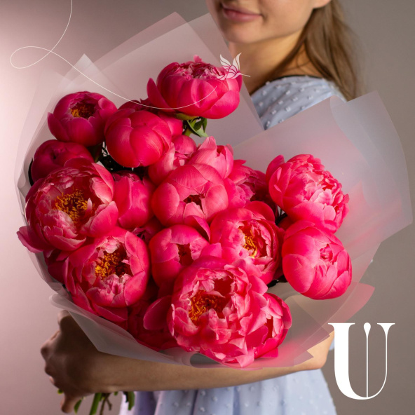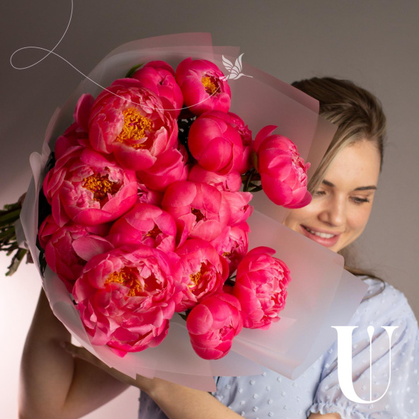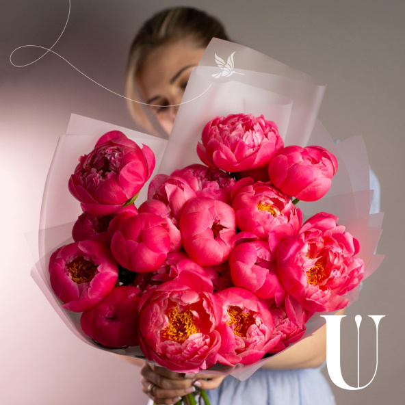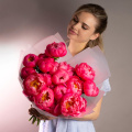 Букет из 13 розовых пионов сорта Сара Бернар в упаковке