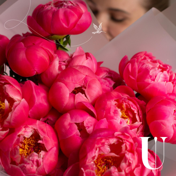 Букет из розовых пионов и лаванды в крафтовой упаковке