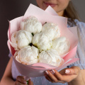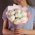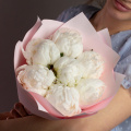 Букет из белых кустовых пионовидных роз сорта Бомбастик в упаковке