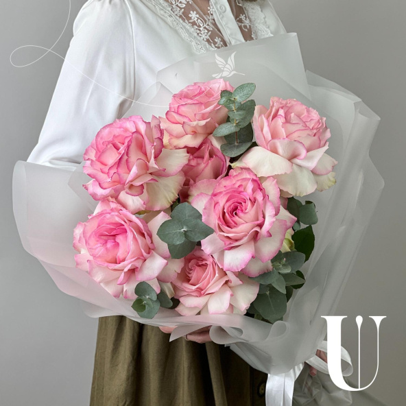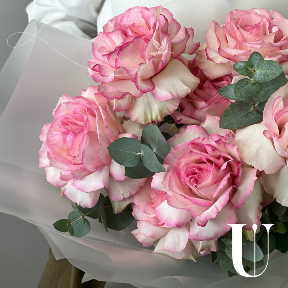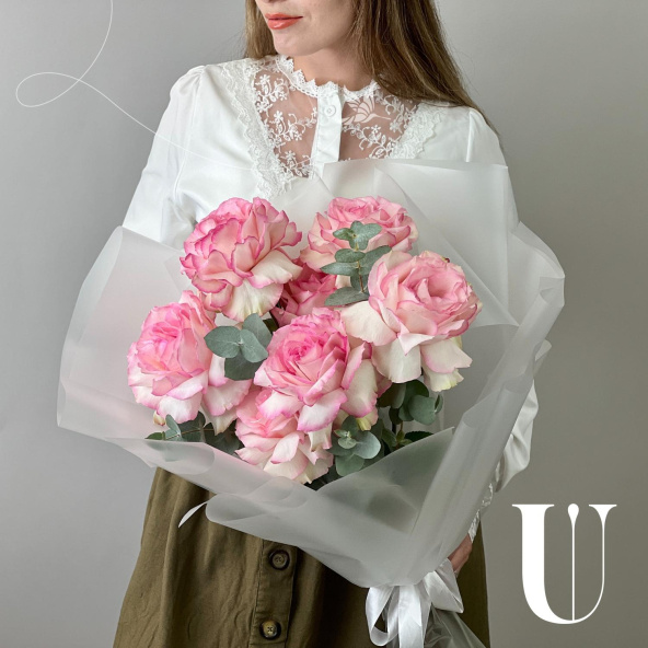Букет из роз сорта Шармант и Маритим в дизайнерской упаковке