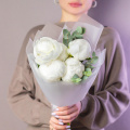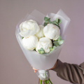 Букет из белых кустовых пионовидных роз сорта Бомбастик в упаковке