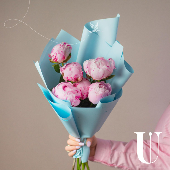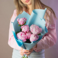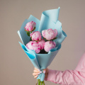 Монобукет из нежно-розовых кустовых пионовидных роз в упаковке