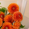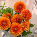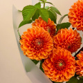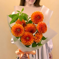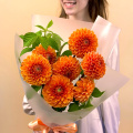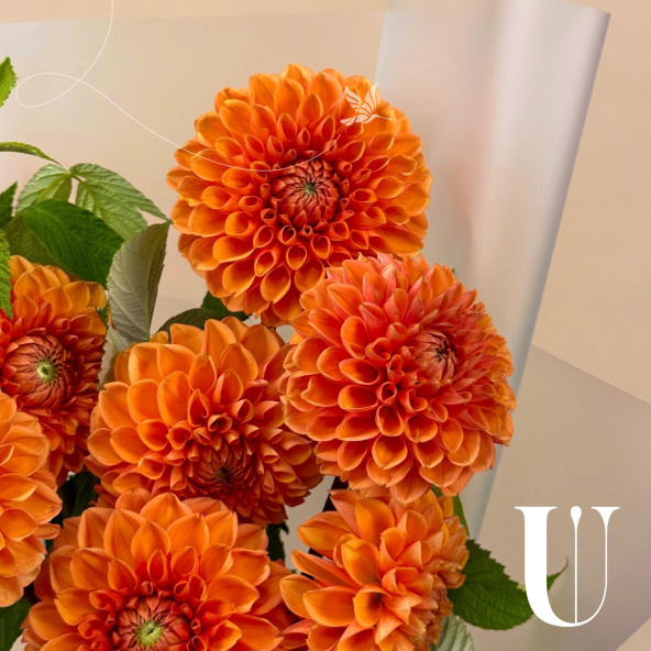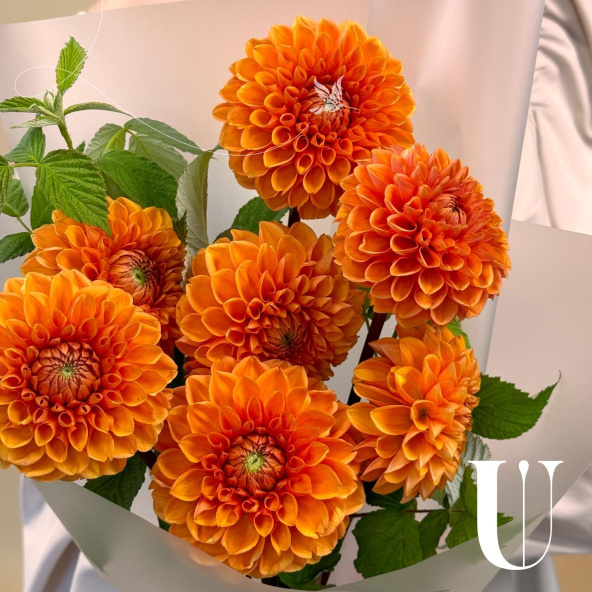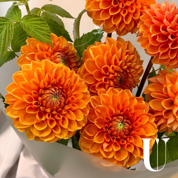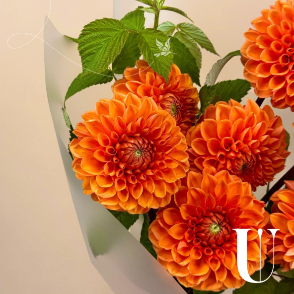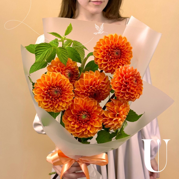 Букет из оранжевых георгинов и веток малины — это яркое и стильное сочетание, которое подойдёт для любого случая. Оранжевые георгины символизируют радость, оптимизм и энергию, а ветки малины добавляют букету свежесть и оригинальность.