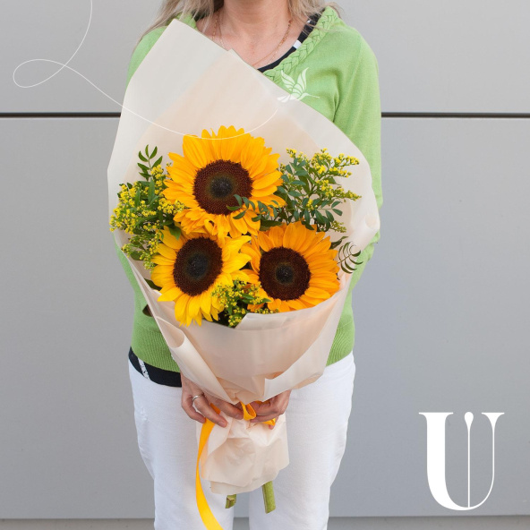 Букет "Лето Золотистое" - это сборный букет, состоящий из двух видов цветов: подсолнуха и солидаго. Эти яркие и солнечные цветы создадут атмосферу радости и тепла, а также подчеркнут вашу заботу и внимание к получателю.