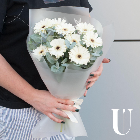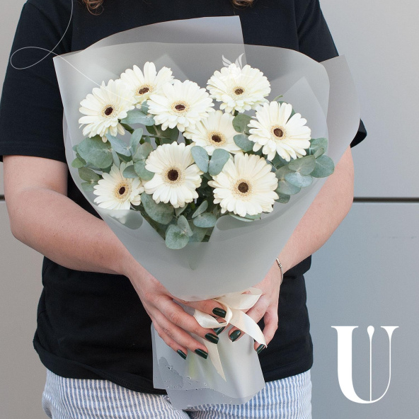 Букет состоит из 9 минигербер белого цвета. Минигерберы - это маленькие, но очень красивые цветы, которые придают букету нежность и воздушность.