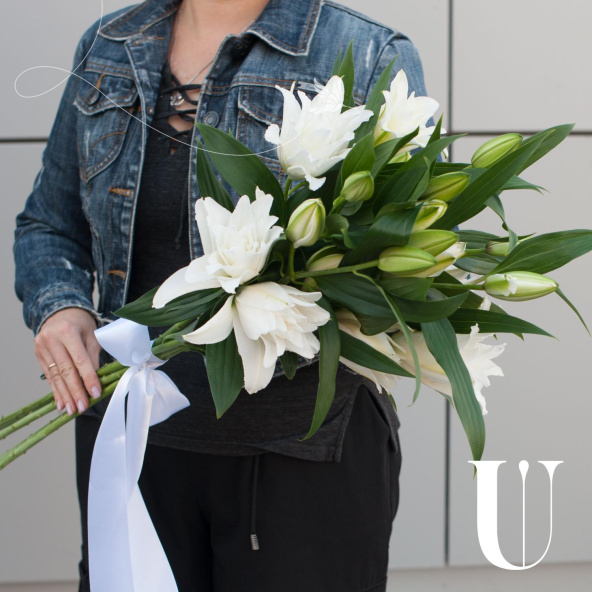 Букет состоит из 5 лилий белого цвета, что придает ему особую нежность и элегантность.