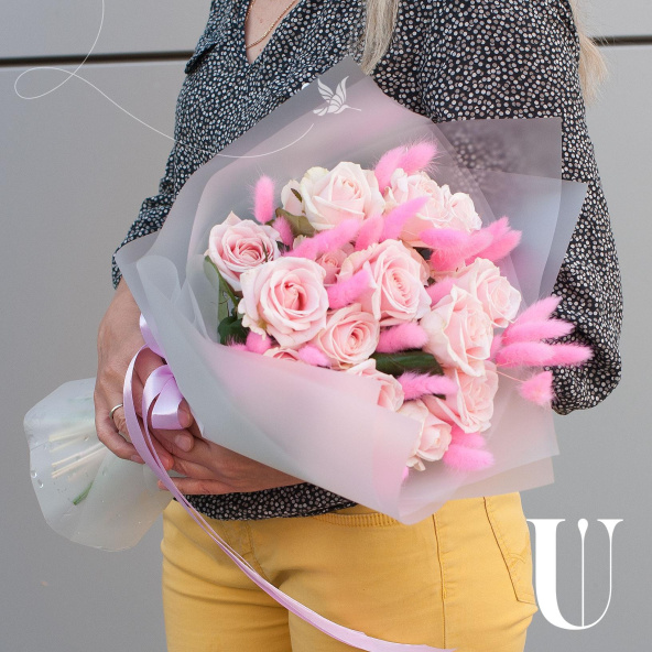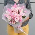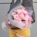 Букет выполнен в нежном розовом цвете, который символизирует любовь, нежность и заботу. Этот оттенок цветов будет уместен на любом празднике, будь то день рождения, юбилей, свадьба или годовщина.