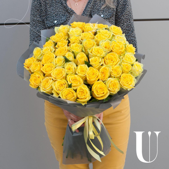 Букет состоит из 49 желтых роз, собранных на стеблях. Это придает букету объем и пышность, делая его ярким и запоминающимся.