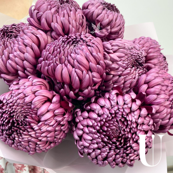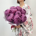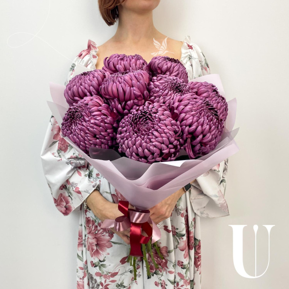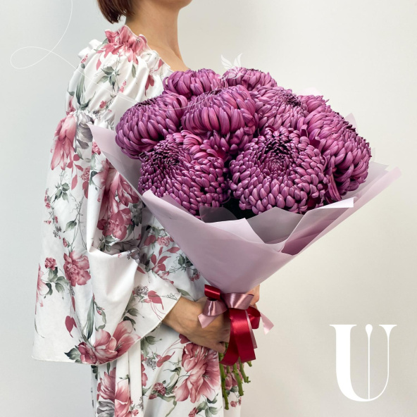 Монобукет из 9 хризантем сорта Бигуди в дизайнерской упаковке