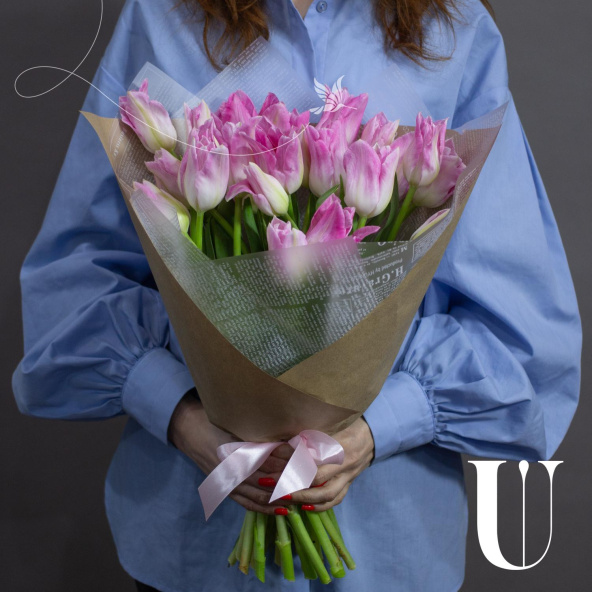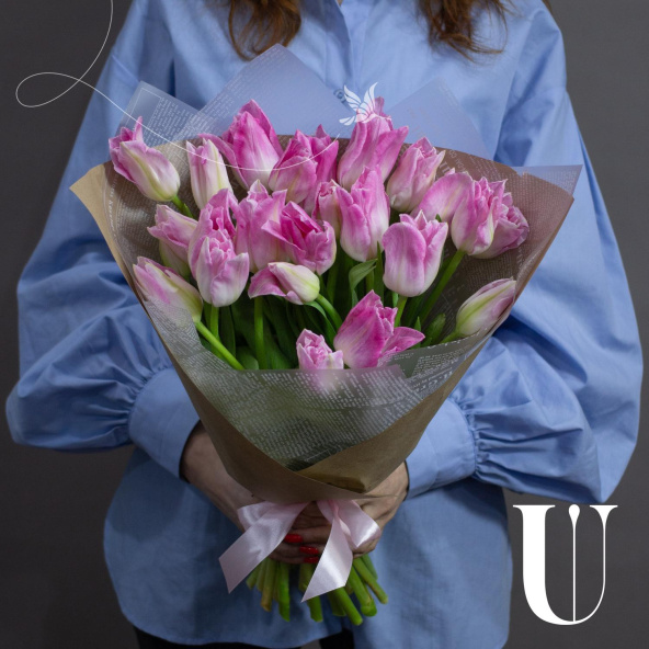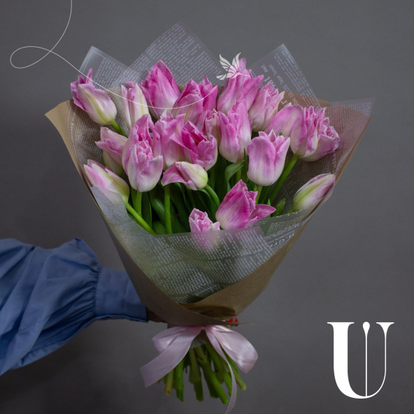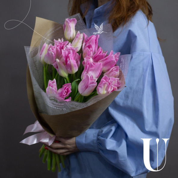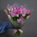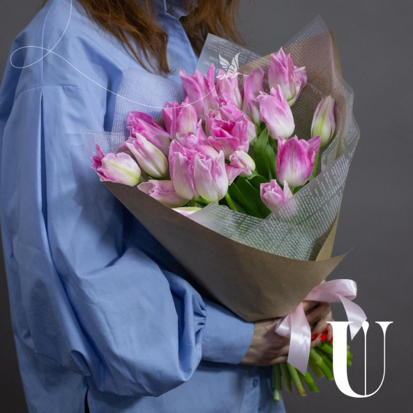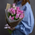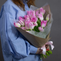 Монобукет из розовых кустовых пионовидных роз в упаковке