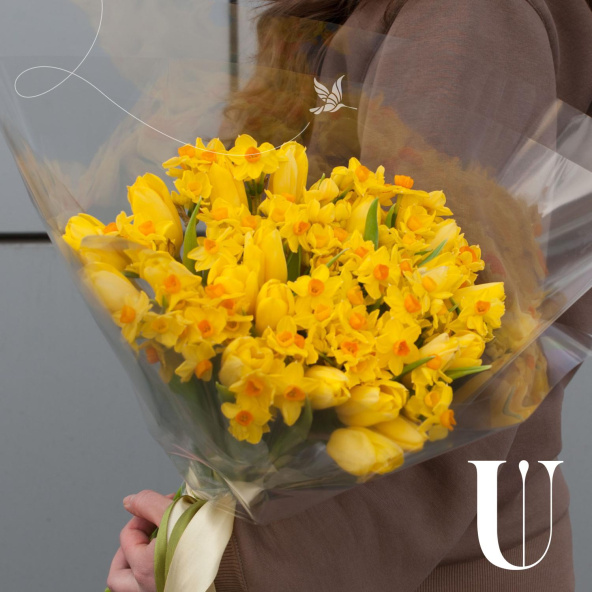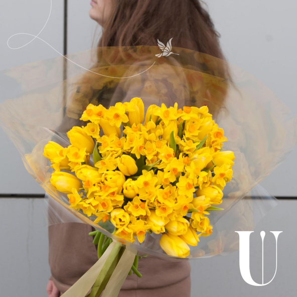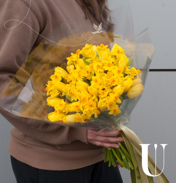 Букет состоит из 41 цветка, включая 21 нарцисс и 20 тюльпанов.