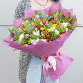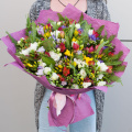 Подарите радость и яркие эмоции с букетом из разноцветных фрезий. В составе букета 101 цветок, которые собраны на стеблях и упакованы в крафт-бумагу с декоративной лентой.