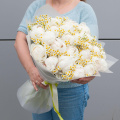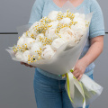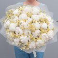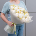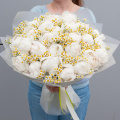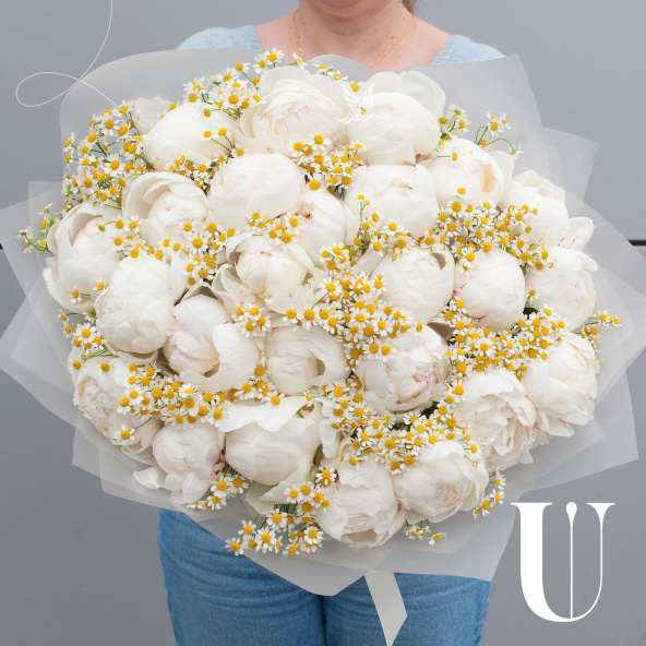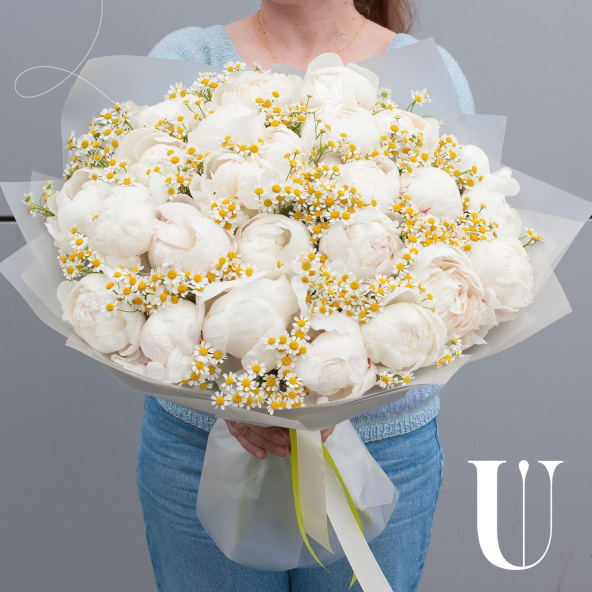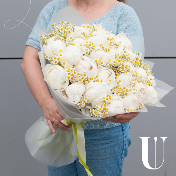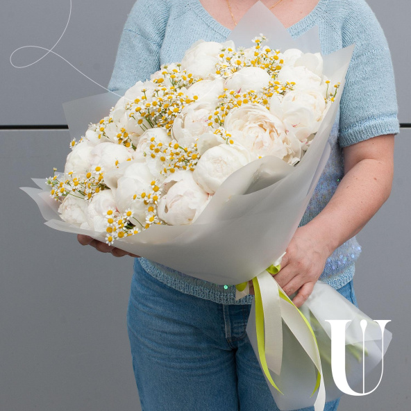 Букет состоит из белых пионов, которые символизируют чистоту и невинность, а также нежность и любовь. Мелкая ромашка добавляет композиции легкости и свежести.