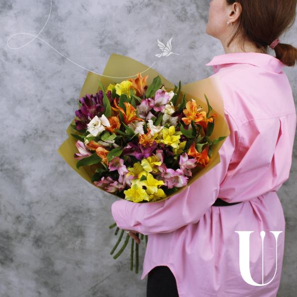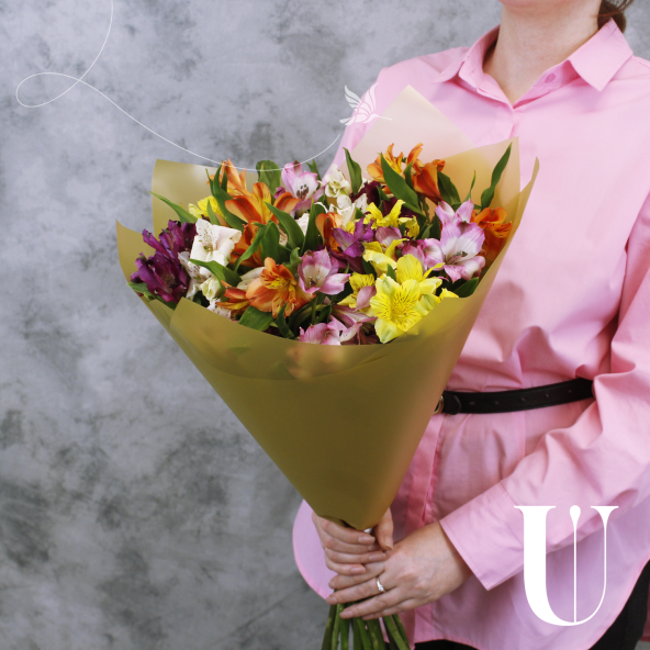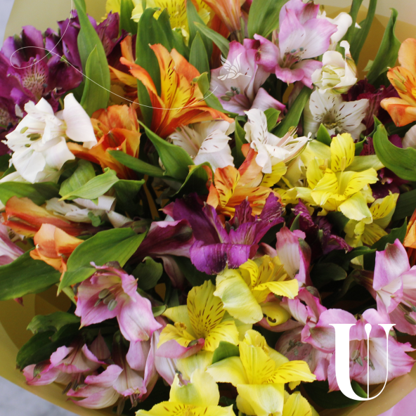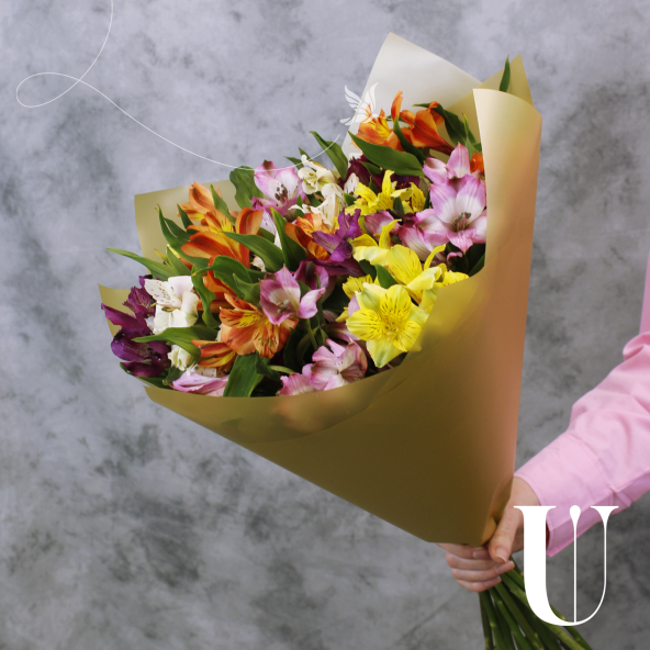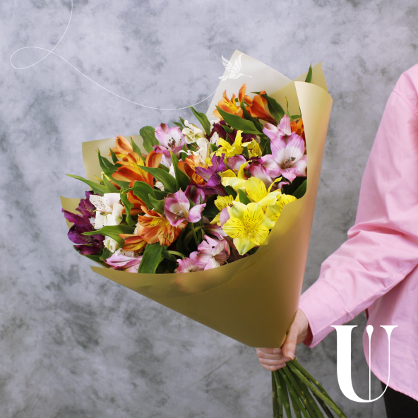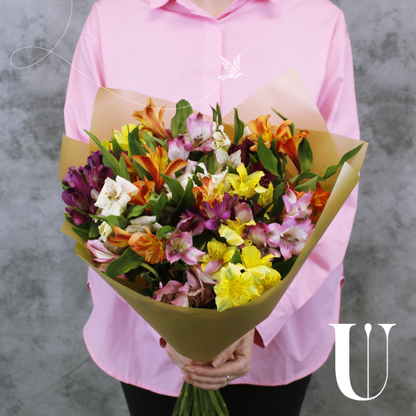 Классический монобукет из 15 разноцветных альстромерий микс в матовой пленке с атласной лентой — это изысканный и стильный подарок, который станет незабываемым сюрпризом для любого торжества или особого случая. Альстромерии в составе букета известны своей стойкостью и долгим сроком жизни, а также визуальной легкостью, свежестью и нежностью.