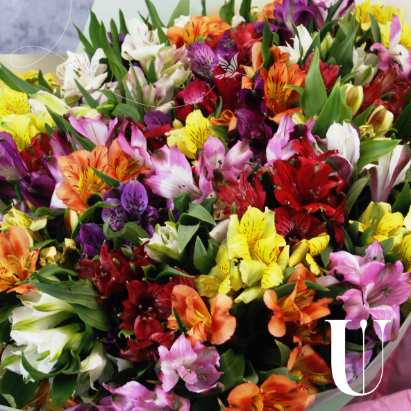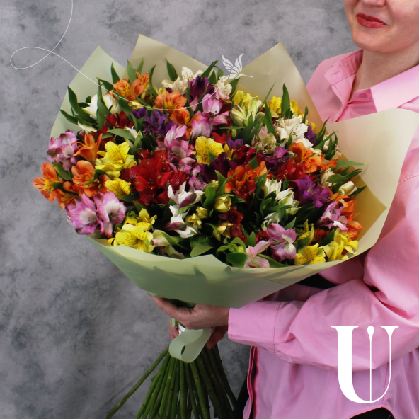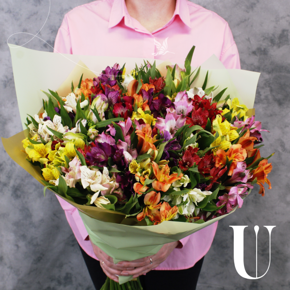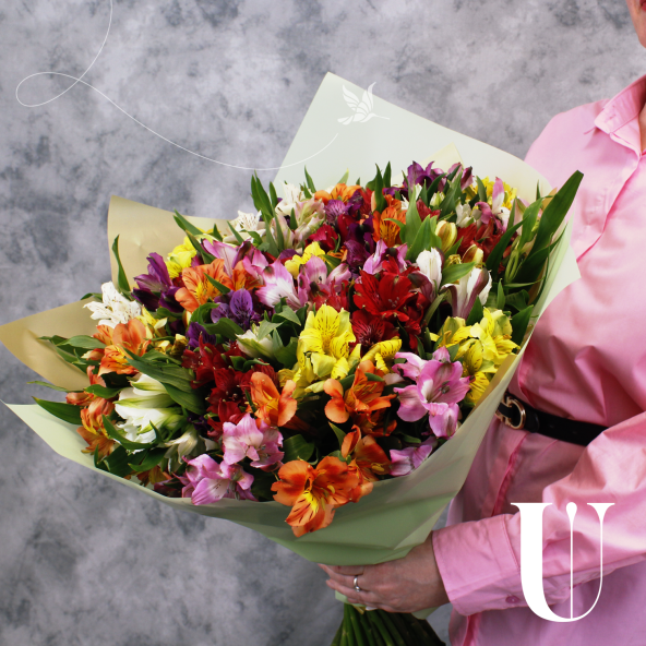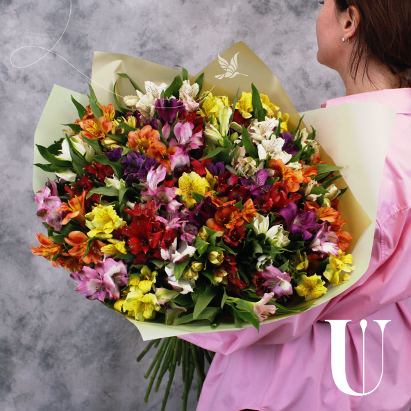 Классический монобукет из 51 альстромерии микс ярких оттенков в матовой пленке с атласной лентой — это изысканный и стильный подарок, который станет незабываемым сюрпризом для любого торжества или особого случая. Альстромерии в составе букета известны своей стойкостью и долгим сроком жизни, а также визуальной легкостью, свежестью и нежностью.