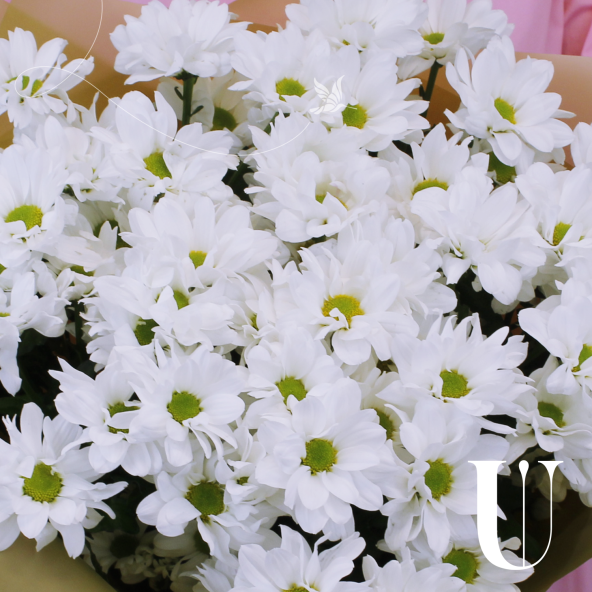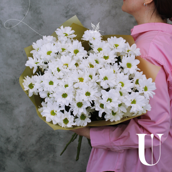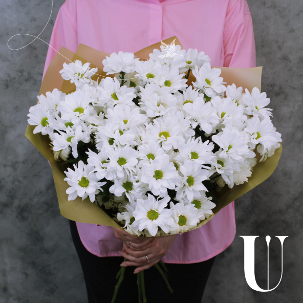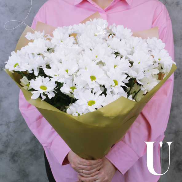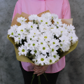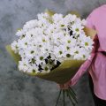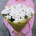 Букет из 9 белых кустовых ромашковых хризантем в матовой пленке с атласной лентой — это отличный выбор для тех, кто хочет подарить радость и тепло близким людям.