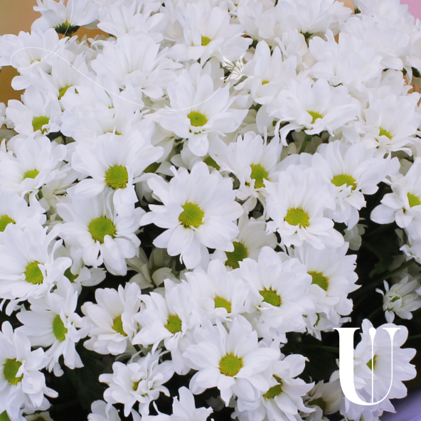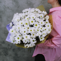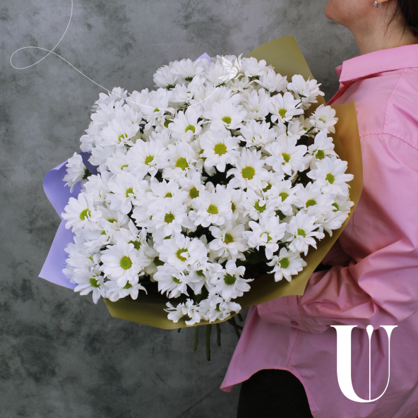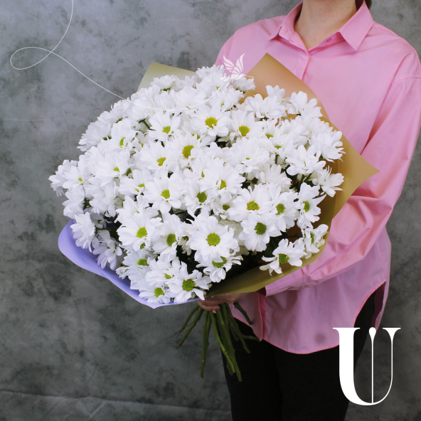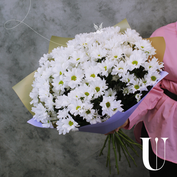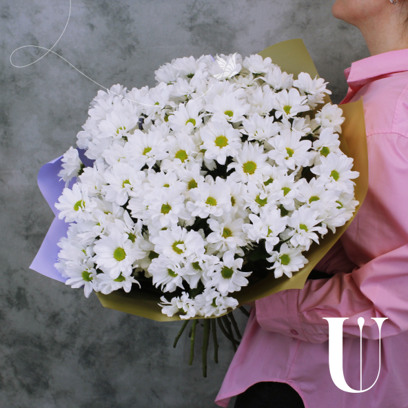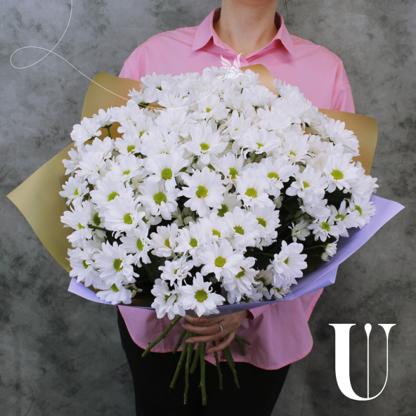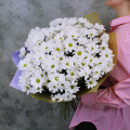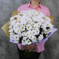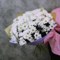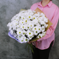 Классический букет из 15 белых кустовых ромашковых хризантем в матовой пленке с атласной лентой — это отличный выбор для тех, кто хочет подарить радость и тепло близким людям.