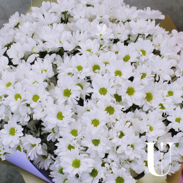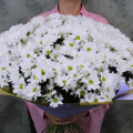 Классический букет из 25 белых кустовых ромашковых хризантем в матовой пленке с атласной лентой — это отличный выбор для тех, кто хочет подарить радость и тепло близким людям.