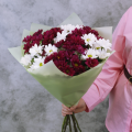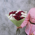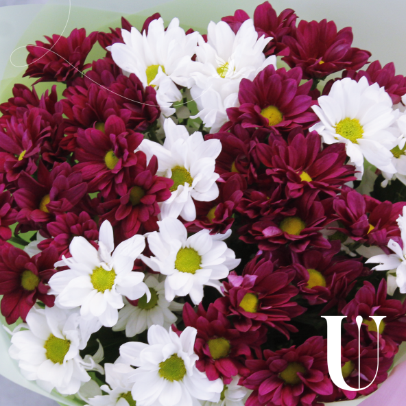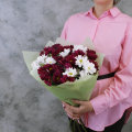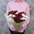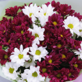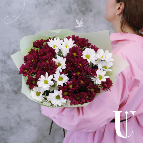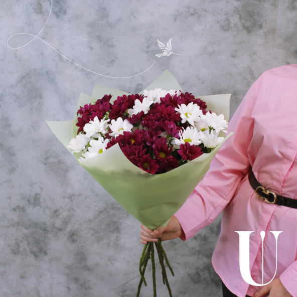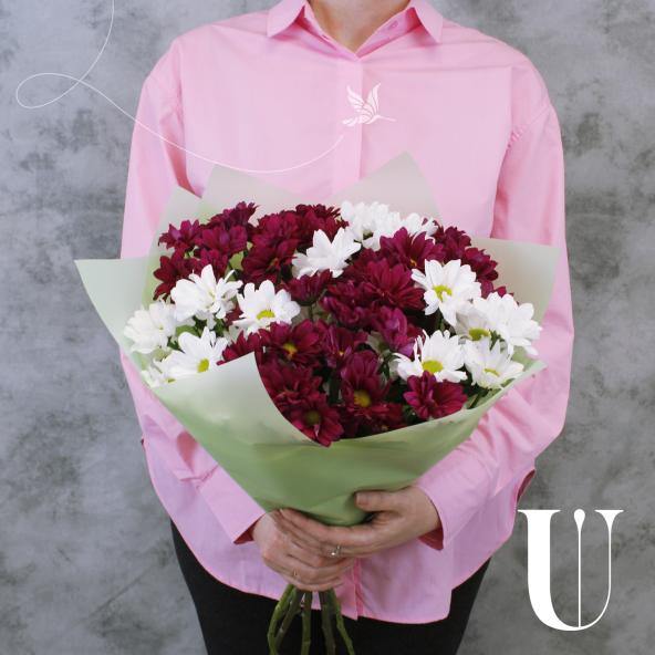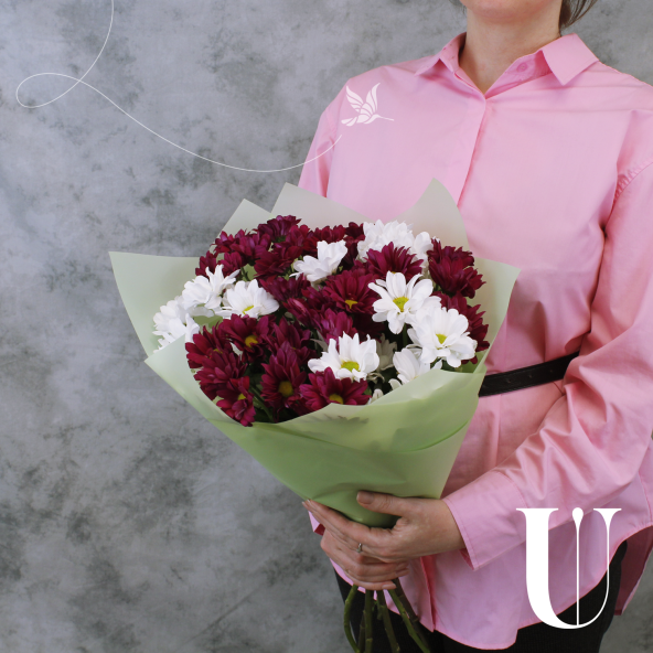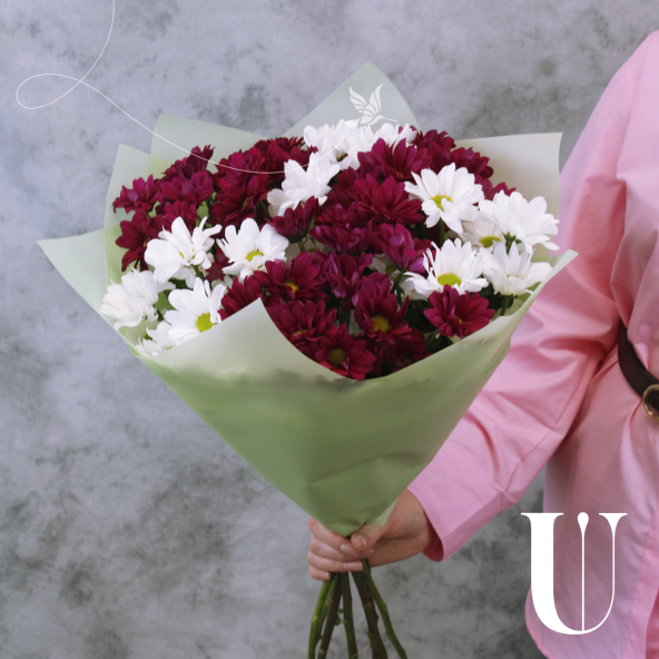 Букет из 7 белых и бордовых кустовых ромашковых хризантем в матовой пленке с атласной лентой — это стильный и элегантный подарок для любого повода. В составе букета 3 белых и 4 бордовых кустовых хризантем, в сочетании они создают гармоничную и насыщенную композицию, которая украсит любой праздник или торжественное событие.