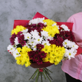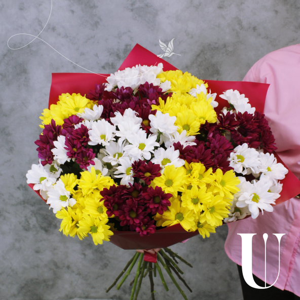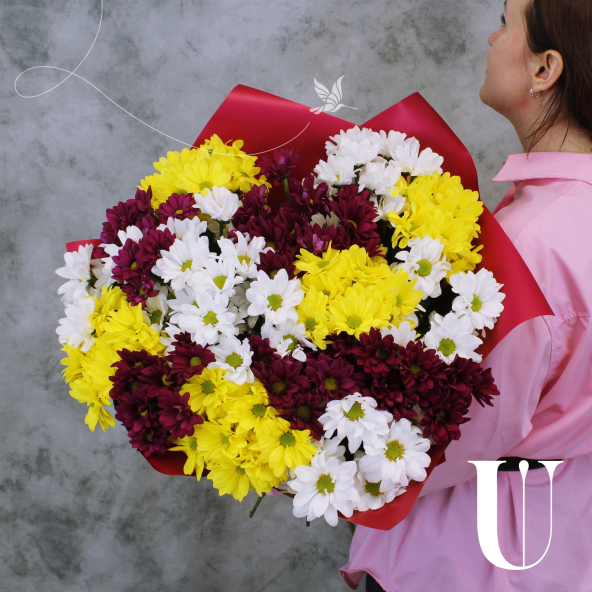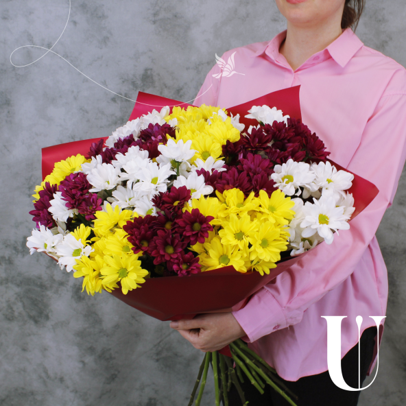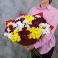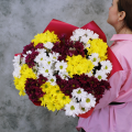 Классический букет из 15 разноцветных кустовых ромашковых хризантем в матовой пленке с атласной лентой — это стильный и яркий подарок для любого повода. Разноцветные кустовые хризантемы в букете создают неповторимую яркую и нежную композицию, которая придется по вкусу даже самому искушенному получателю.