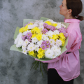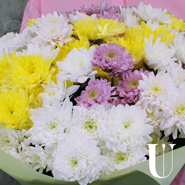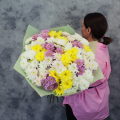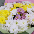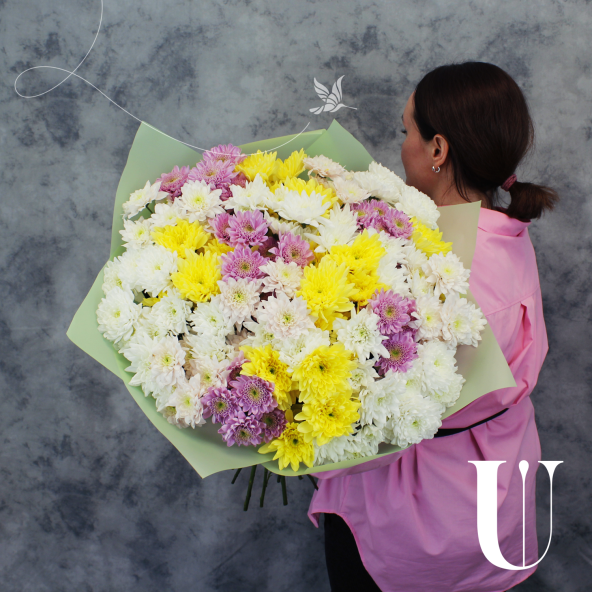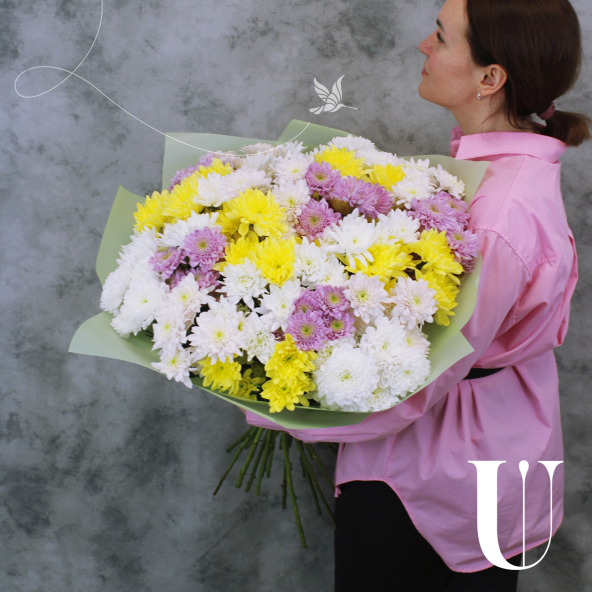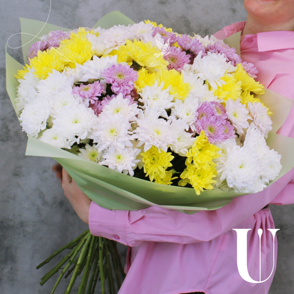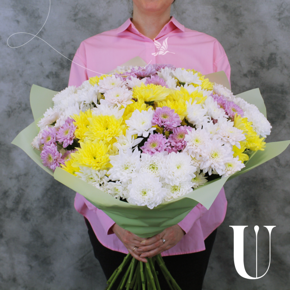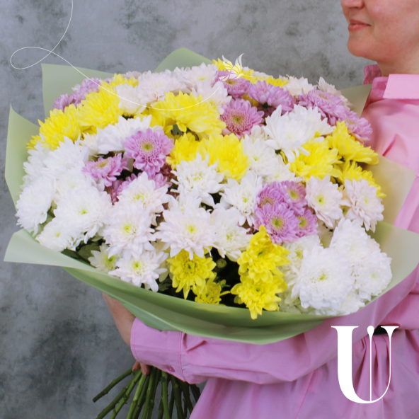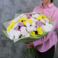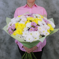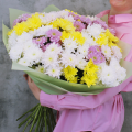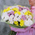 Классический букет из 25 разноцветных кустовых хризантем в матовой пленке с атласной лентой — это стильный и элегантный подарок для любого повода. Разноцветные кустовые хризантемы в букете создают неповторимую яркую и нежную композицию, которая придется по вкусу даже самому искушенному получателю.