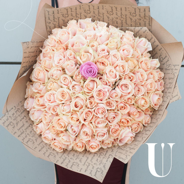 Букет состоит из 101 цветка, включая 100 персиковых роз и одну розовую розу. Такой состав цветов делает букет ярким и запоминающимся.