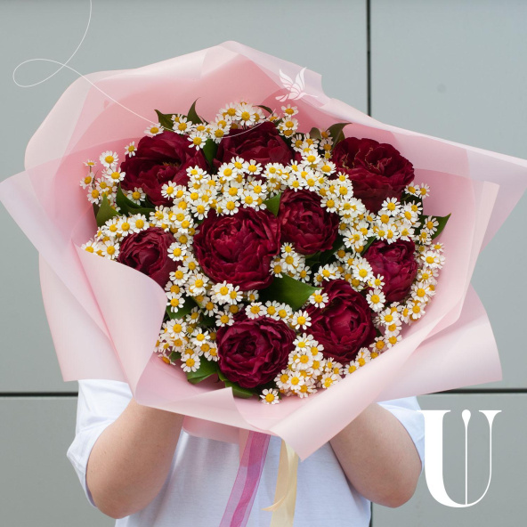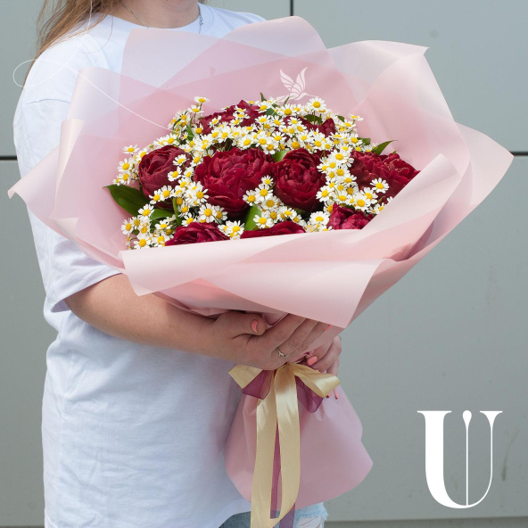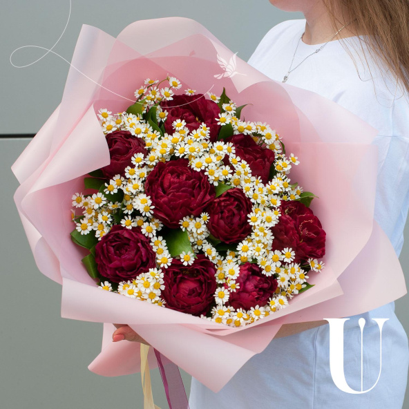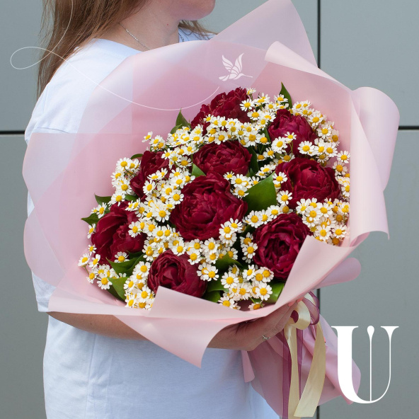 Букет состоит из 25 цветов, включая 9 бордовых пионов и 14 белых ромашек. Такое сочетание цветов создает яркий и насыщенный образ, который будет радовать получателя своей красотой и свежестью.